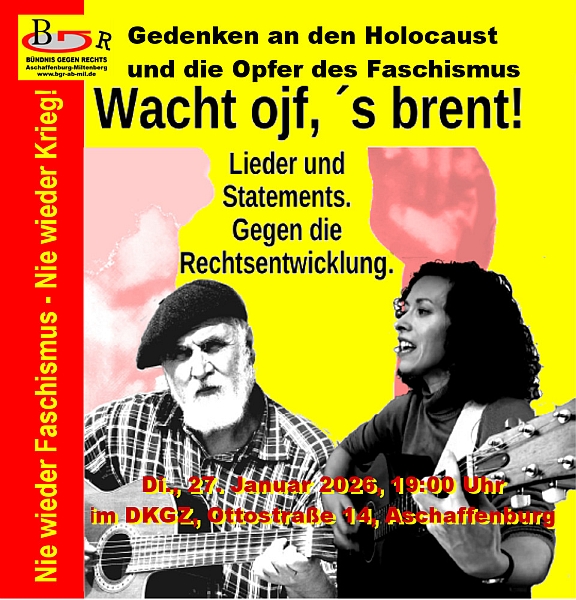 Unter dem Titel „Wacht ojf, ´s brent!“ bieten Maren Sequens und Reinhard Frankl unter anderem Songs in der Traditions-Pflege jiddischer Kultur dar. Dazwischen wird es Statements zur landes- wie weltweiten aktuellen Rechtsentwicklung geben.
